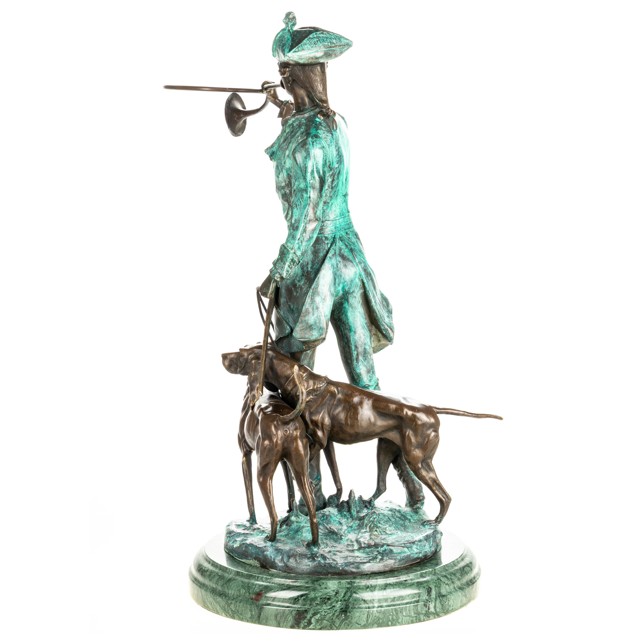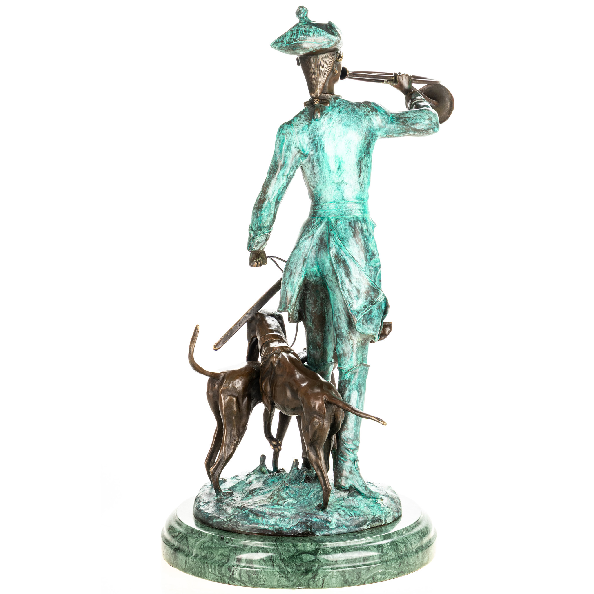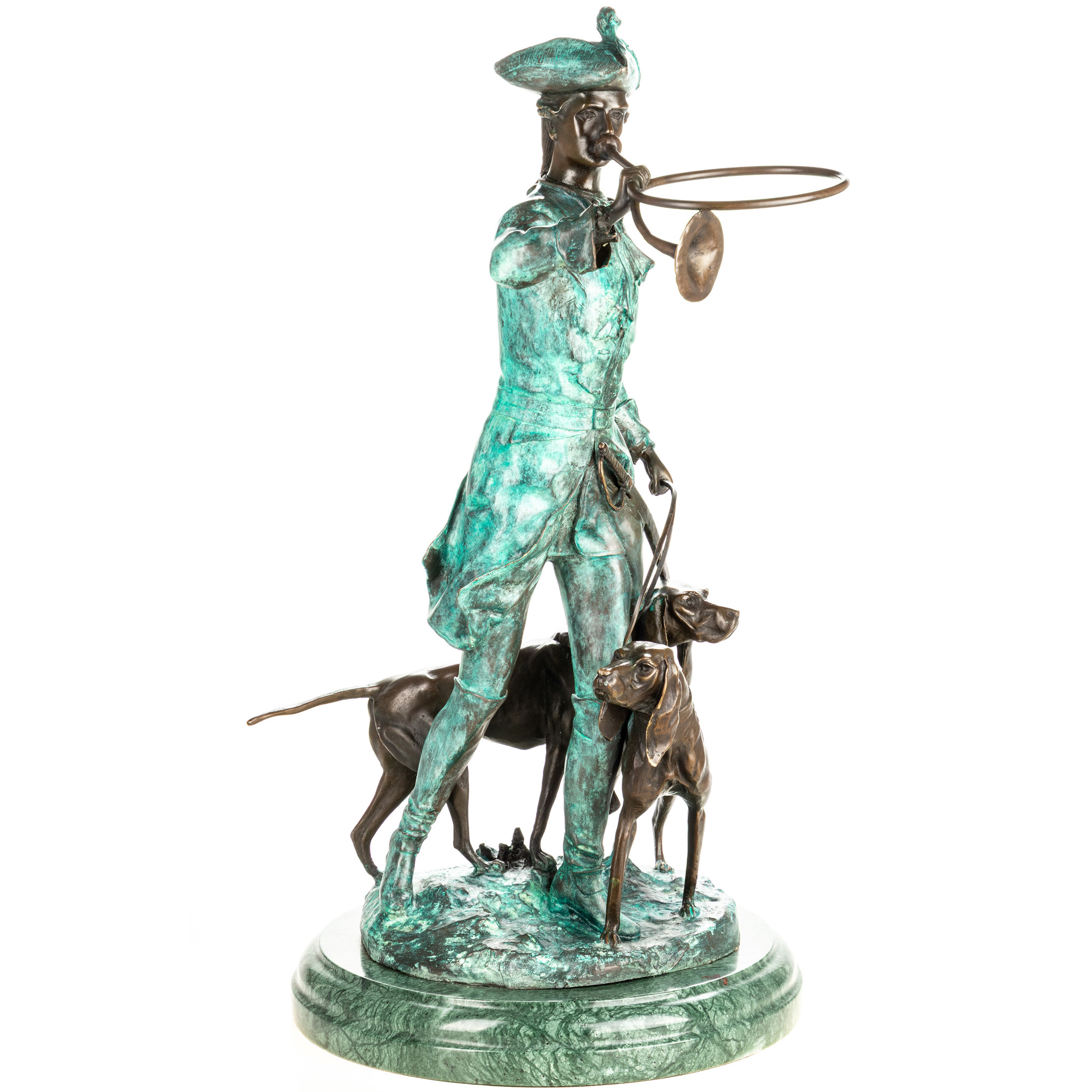 LeírásVélemények Leírás Vadász vadászkutyákkal, vadászkürttel - bronz szobor zöld patinával márványtalpon. Mérete: 68x45x30 cm. Tömege: 24 kg. Anyag: 100% bronz. A.Moreau alkotása alapján Vélemények Írjon értékelést! Még nincsenek értékelések Skip list Termék címkék állatábrázolás 103 bronz szobor 771 vadászat 5